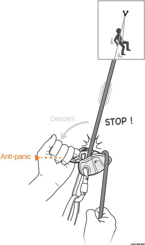 - De paniekhendel stopt de touwtoevoer als er tijdens het laten zakken te hard aan de hendel wordt getrokken.