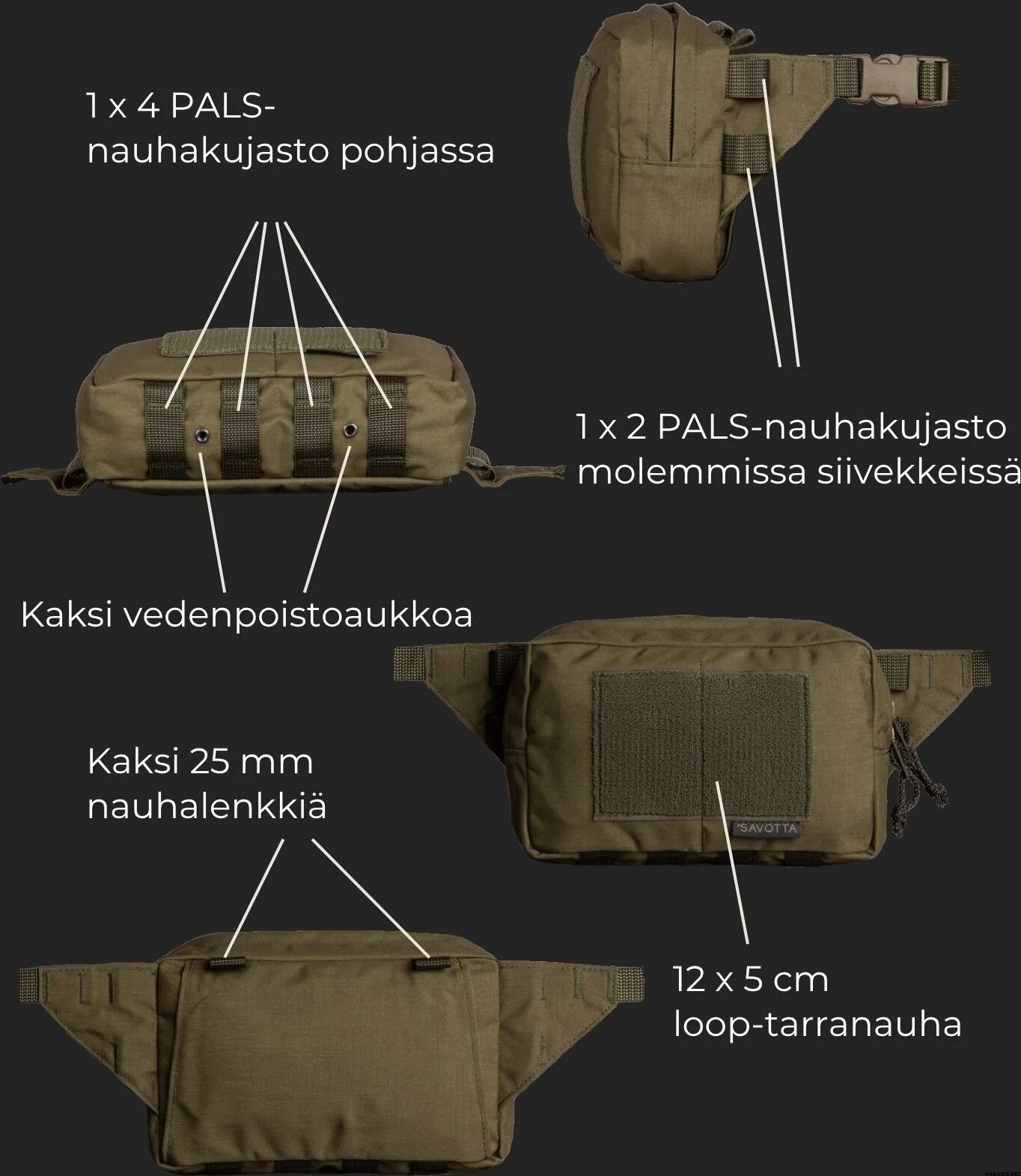 De Savotta Suur-Kukkaro heuptas is een middelgrote heuptas, ontworpen voor wie efficiënte organisatie en meerdere bevestigingsmogelijkheden nodig heeft. Deze heuptas biedt een ruim interieur met verschillende compartimenten en externe bevestigingspunten, waardoor hij aanpasbaar is voor verschillende doeleinden. Met een inhoud van ongeveer 2,6 liter beschikt hij over een groot hoofdvak met rits, platte vakken en elastische lussen voor het opbergen van kleine spullen. De tas heeft ook een plat vak om de riem te verbergen en kan aan een gewone riem of rugzak worden bevestigd.