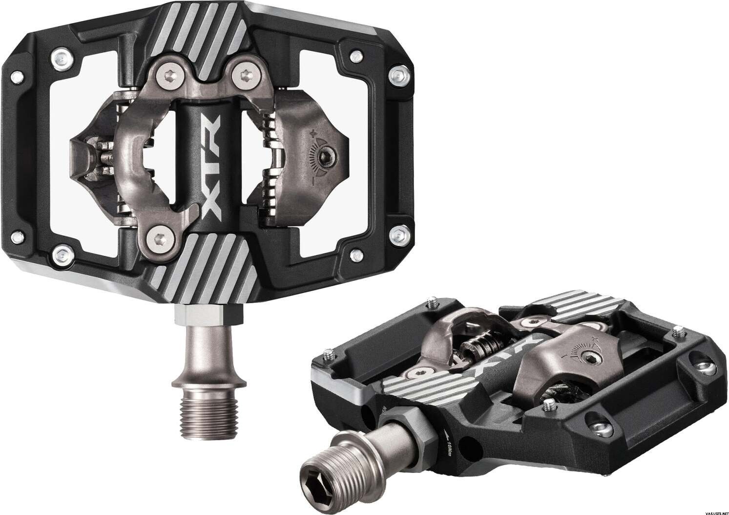 Shimano PD-M9220 XTR Pedal SPD med klosse CL-MT001 er en robust enduropedal designet for intens stikjøring og konkurranser. Denne pedalen på XTR-nivå tilbyr et bredere kontaktområde for forbedret tråkkeffektivitet under klatringer, mens den hevede plattformen og greppinnene forbedrer kontroll og stabilitet i utforkjøringer. Pedalens slitesterke ytre bur beskytter mot støt og sikrer lang levetid på ulendte stier. Den inkluderer CL-MT001 SPD-klossen, som muliggjør flerveis innkobling, noe som gjør den enklere å aktivere fra alle vinkler.