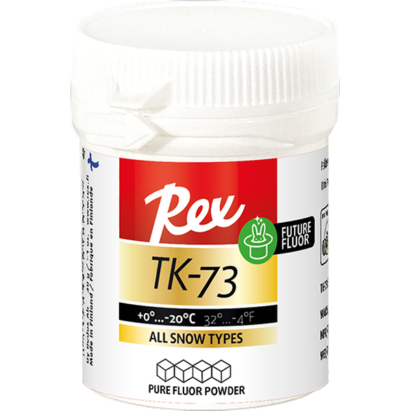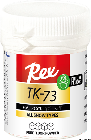 Rex TK-73 Future Fluor -pulveri on erinomainen pakkaskelin yleispulveri, jolla parannat suksiesi luistoa aina! Toimii todella laajalla kelialueella ja kaikilla lumityypeillä. Tässä fluoripulverissa on käytetty Rex Future Fluor -teknologiaa, jonka ansiosta tämä pinnoite on PFOA-vapaa.