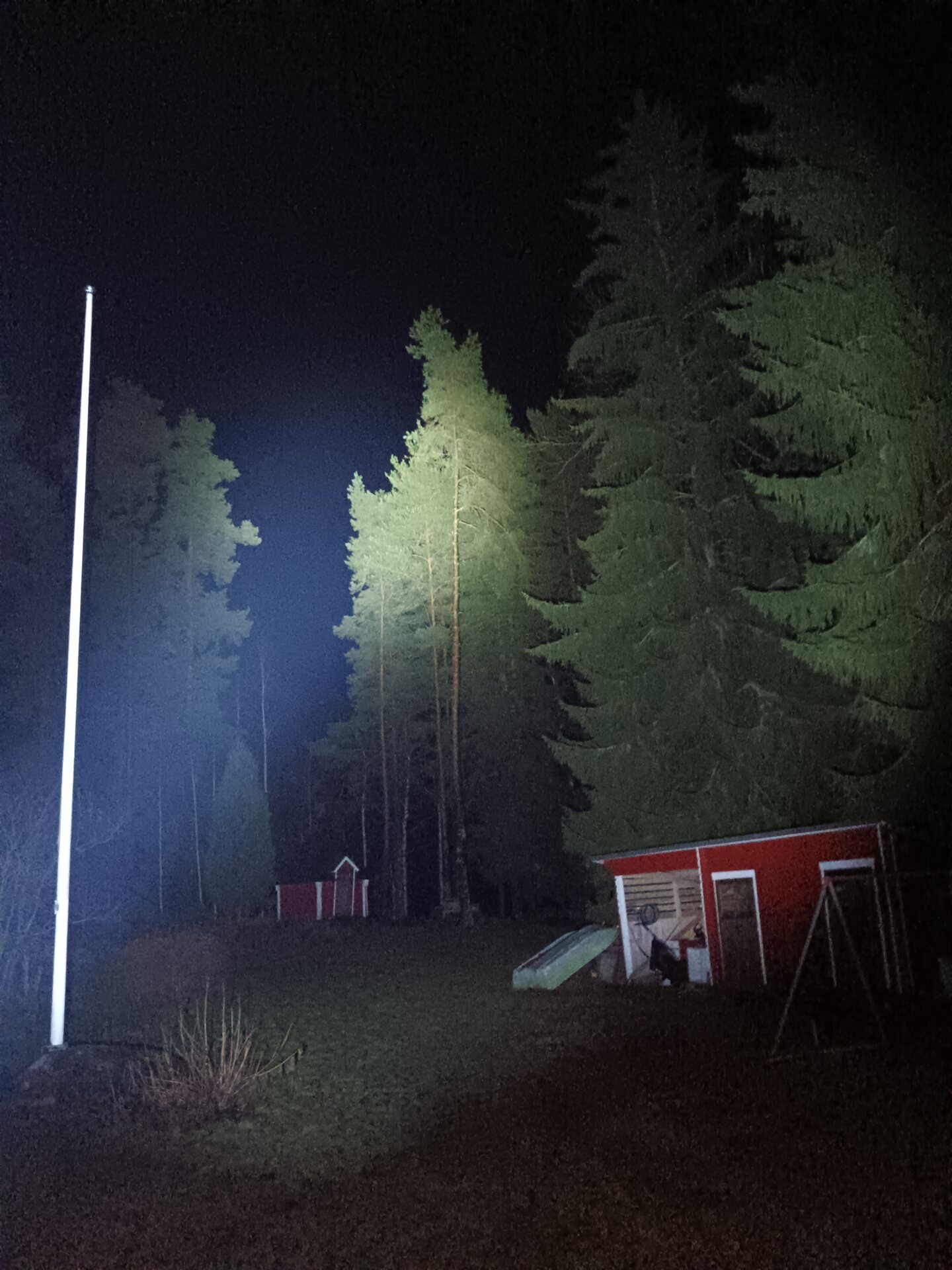 Riittävä valoteho pimeimpäänkin metsään. Latausliitin hauskassa paikassa.