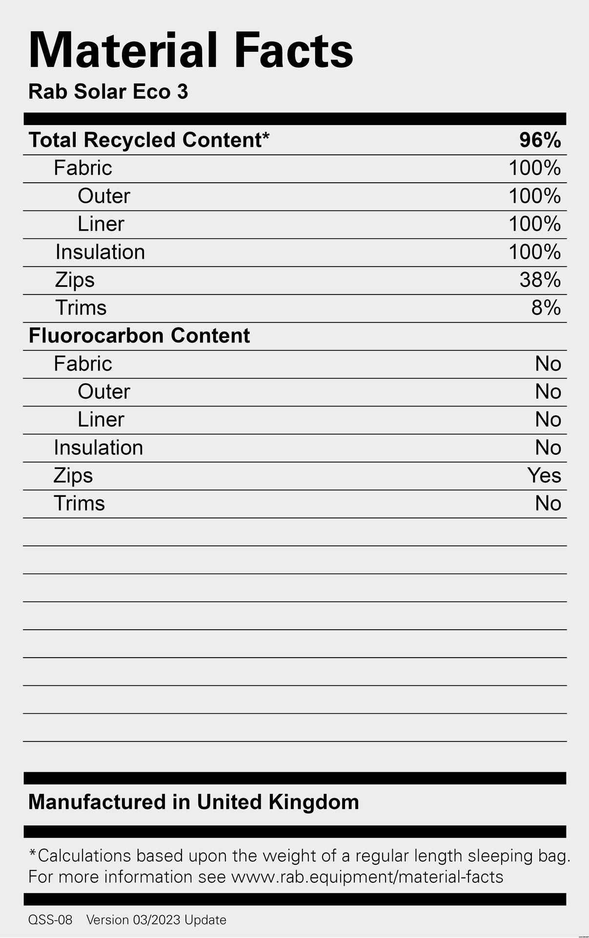 Rab Solar Eco 3 Wide on viileille keleille passeli, normaalia mitoitusta leveämpi keinokuitumakuupussi, joka on valmistettu 100 % kierrätetyistä materiaaleista. Se on täydellinen kolmen vuodenajan pussi maailmaa kierteleville matkailijoille, vuoristossa liikkuville seikkailijoille sekä viileissä olosuhteissa vaeltaville retkeilijöille.