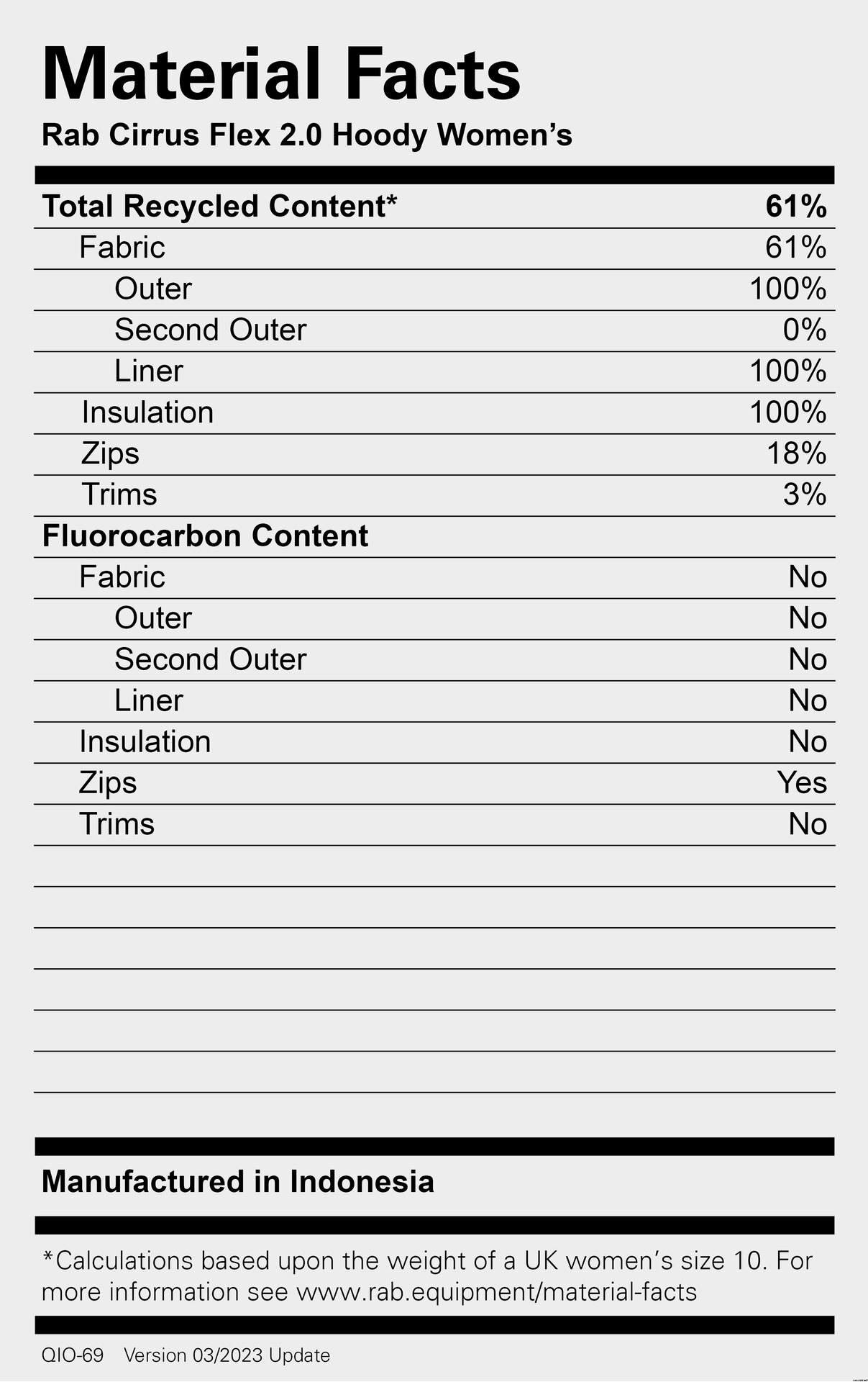 RAB Cirrus Flex 2.0 Hoody Womens on kevyesti topattu takki vauhdikkaaseen menoon. Toimii viileällä kelillä loistavasti vaikkapa t-paidan päällä. Mukautuvuutensa ansiosta asettuu myös hienosti välikerrokseksi kylmissä olosuhteissa kuoritakin alla. Tässä kevyessä takissa on hengittävät fleecepaneelit ja 100% kierrätetty Primaloft Silver Luxe-synteettinen vuori. Materiaali kestää hyvin kulutusta, ja siinä on joustavaa ja hengittävää materiaalia hihojen alla-näin kosteus pääsee siirtymään poispäin. Huppu on vuorattu ja joustava, jonka alle RABin ollessa kyseessä mahtuu tietenkin myös kypärä. Hihansuut joustavat ja helmasta löytyy lukittava kiristysnauha. Nopeasti kuivuva ja lämmin takki, joka pakkautuu tarvittaessa vaikka omaan taskuunsa.