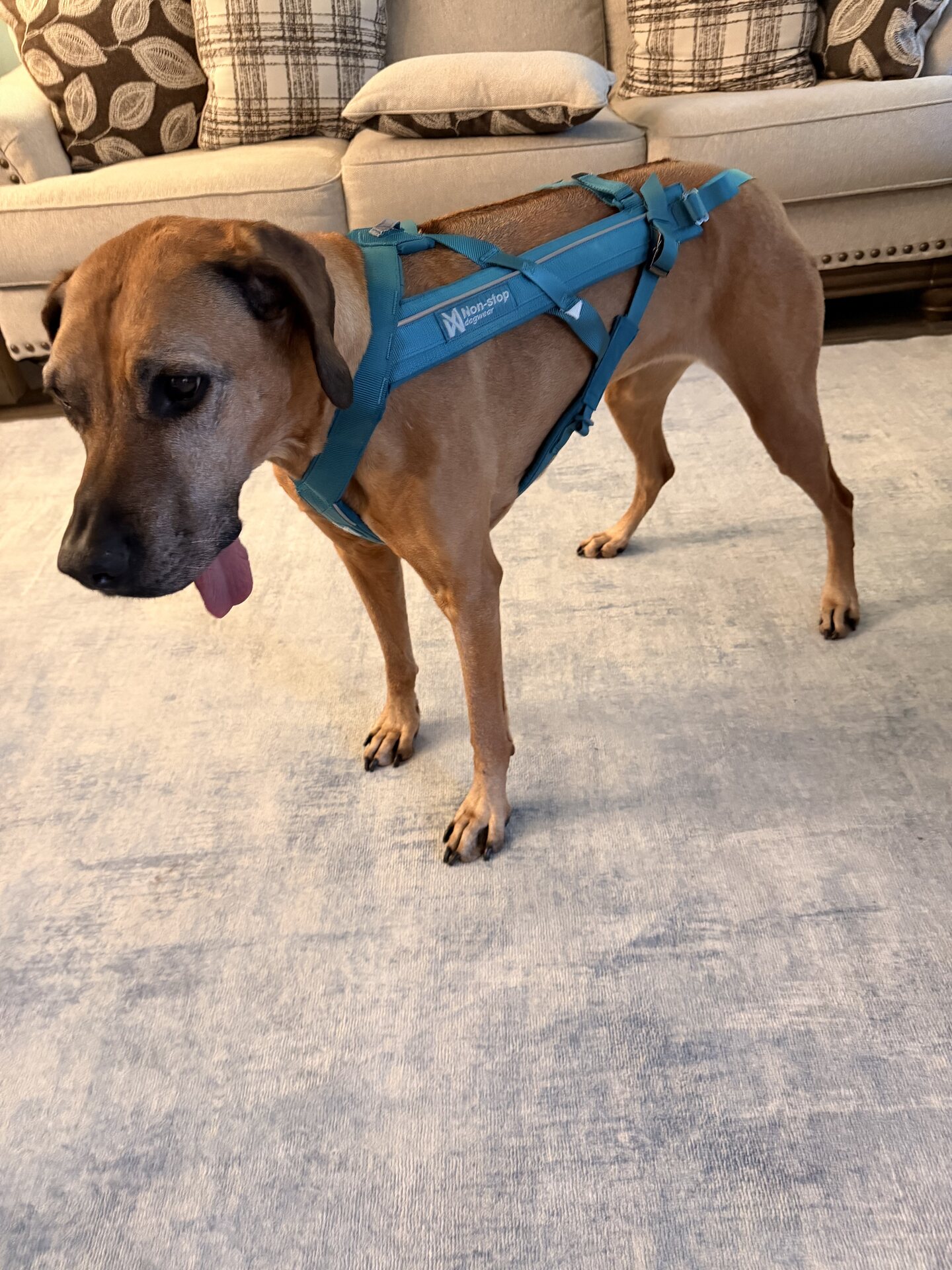 Väri on ihana, mutta istuvuus ei sovi labradorinnoutajalle. Se puristaa niskaa ja jäykkä, napakka materiaali viiltää sitä.