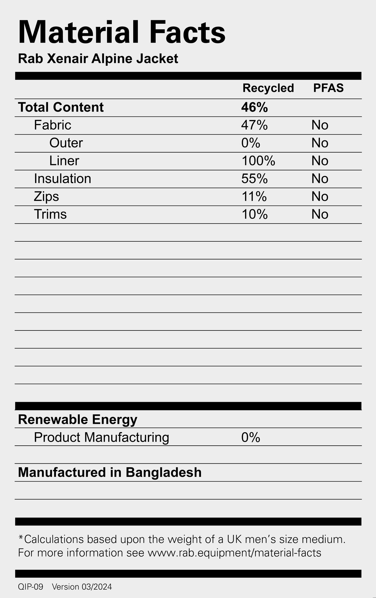 Takki on valmistettu Pertex Quantum Air -kankaasta, joka hengittää hyvin ja antaa säänsuojaa. Kangas on viimeistelty fluorihiilettömällä DWR-käsittelyllä.
