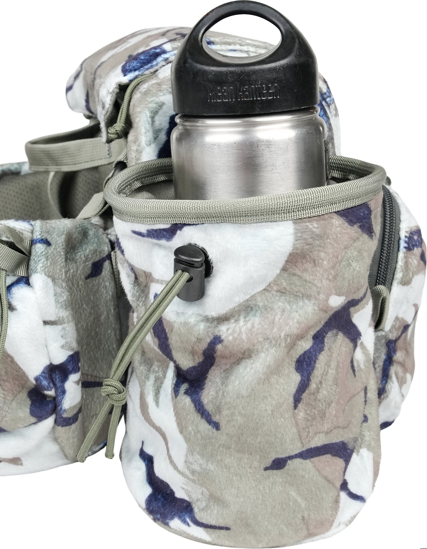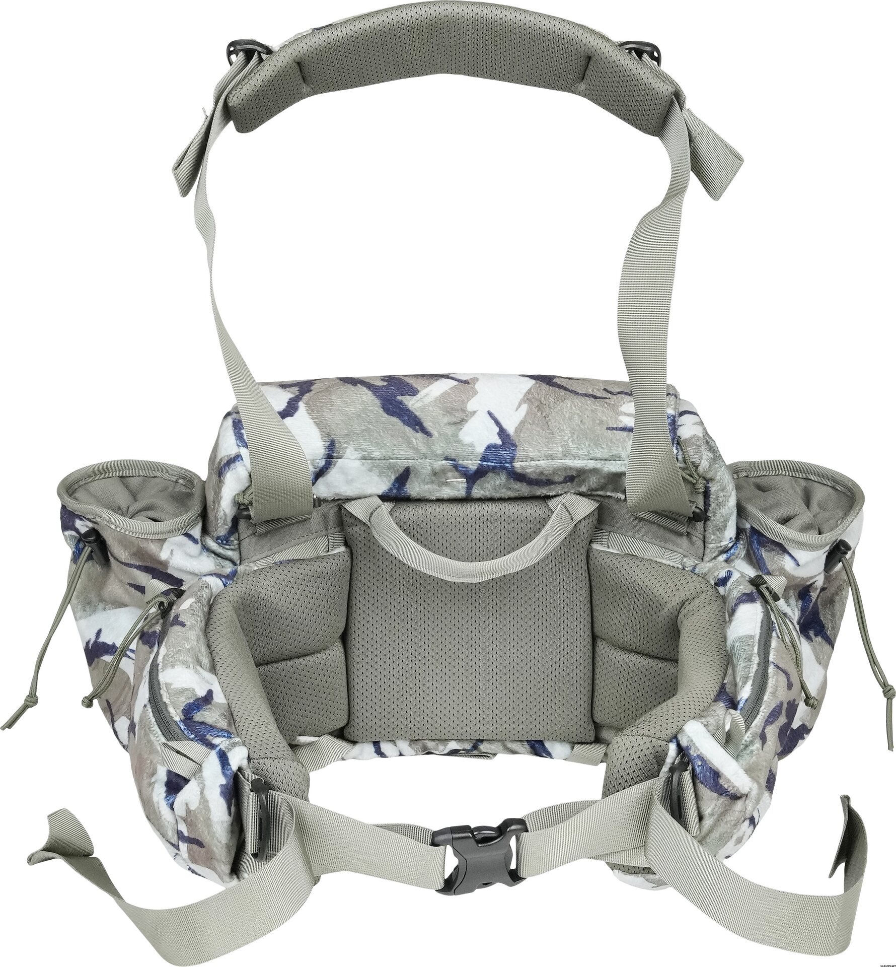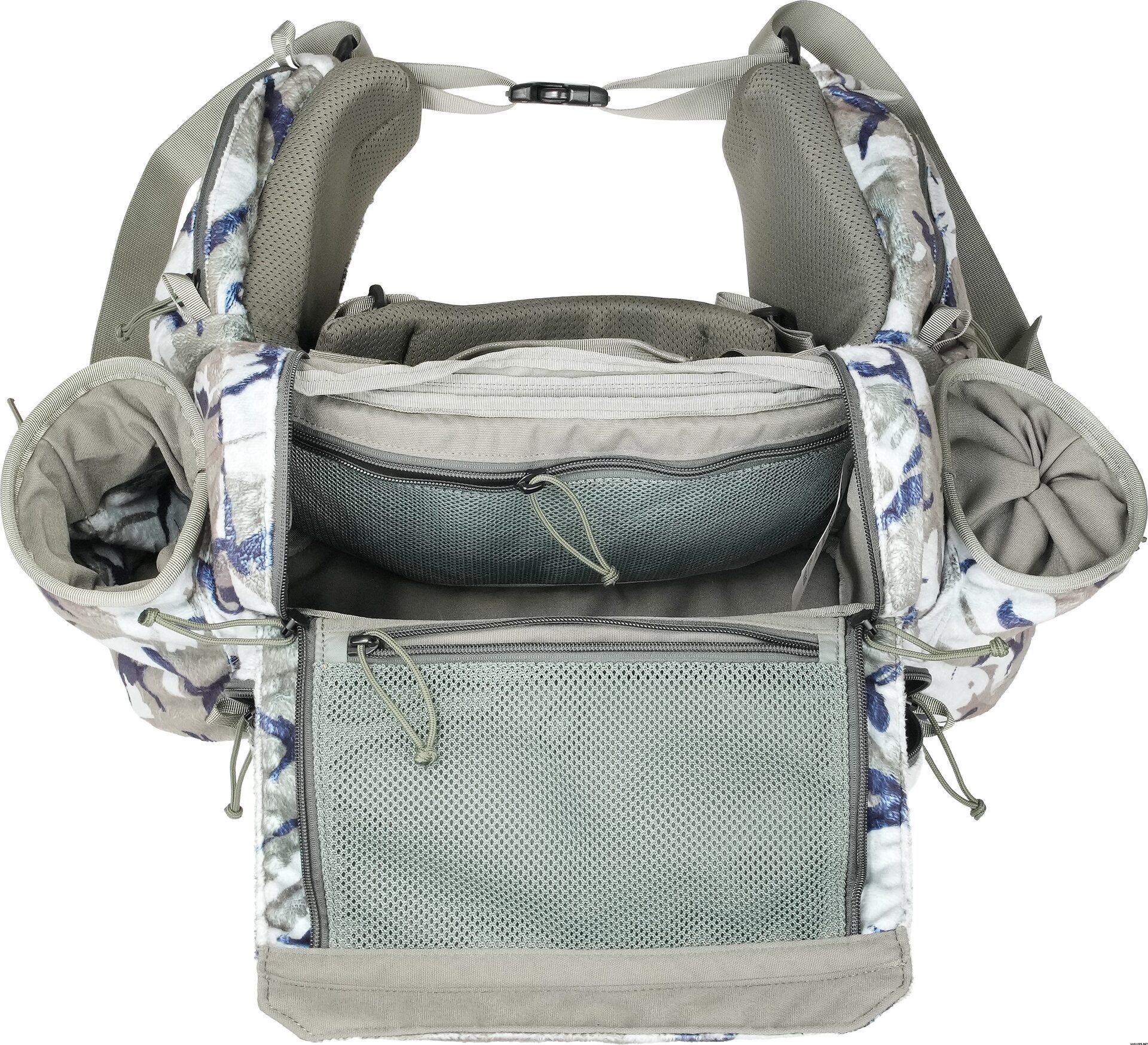 Two side pockets with elastic pull cords for securing water bottles, handheld archery releases, calls, and ammunition