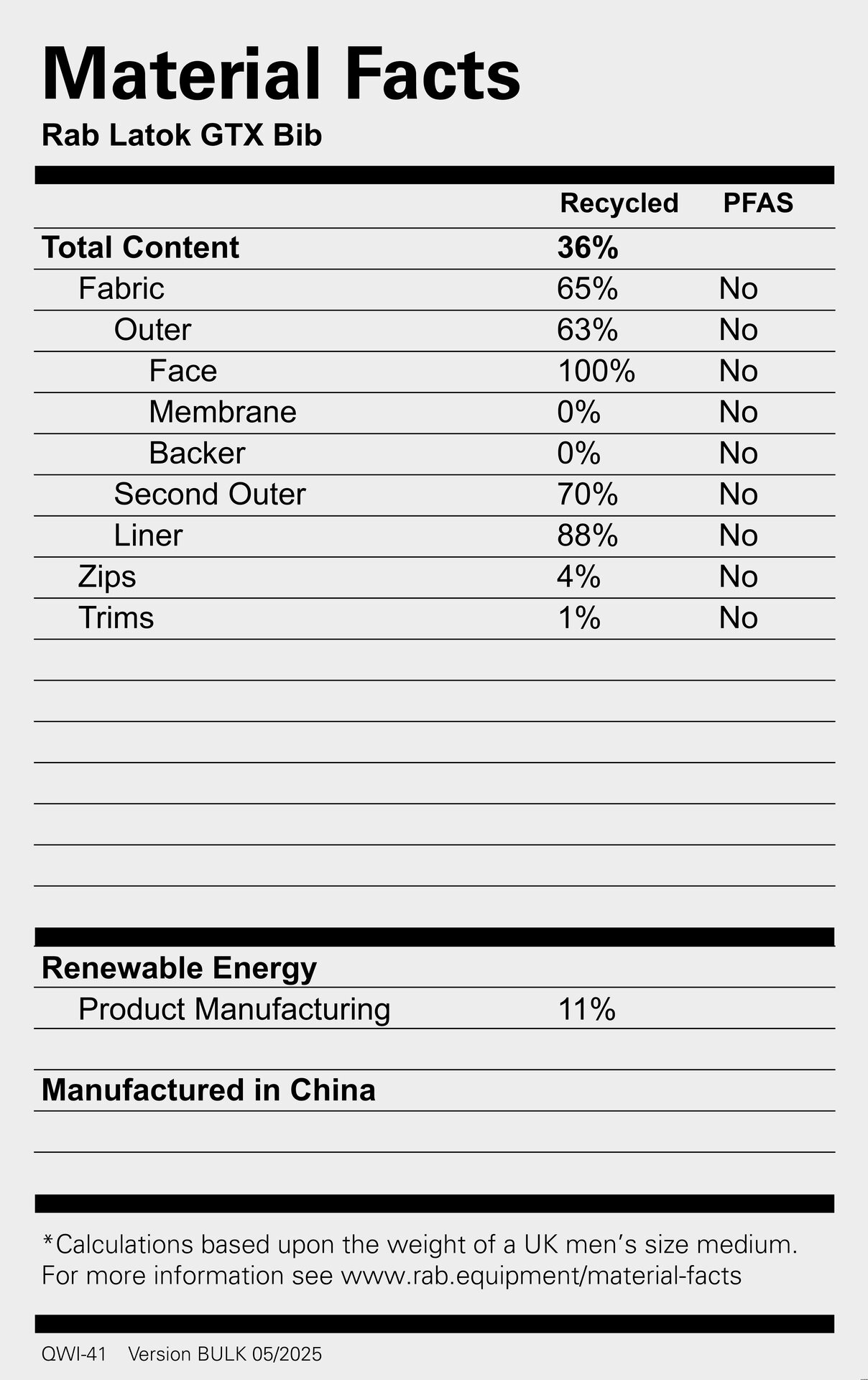 Rab Latok GTX Bib Mens tarjoaa erinomaisen suojan haastavissa sääolosuhteissa kiipeilijöille ja vuorikiipeilijöille. Miesten kuorihousut on suunniteltu kestäviksi ja suorituskykyisiksi, ja ne sopivat erinomaisesti retkikuntien tarpeisiin. Korkea bib-malli varmistaa saumattoman yhteensopivuuden takkien kanssa, muodostaen vahvan suojan sääolosuhteita vastaan. Valmistettu 80D Gore-Tex Pro -teknologialla, nämä housut tarjoavat erinomaisen vedenpitävyyden ja hengittävyyden, kun taas vahvistetut lahkeensuut suojaavat kiveniskuilta ja jääraudoilta. Kevyet mutta kestävät, ne mahdollistavat vapaan liikkumisen äärimmäisissä olosuhteissa.