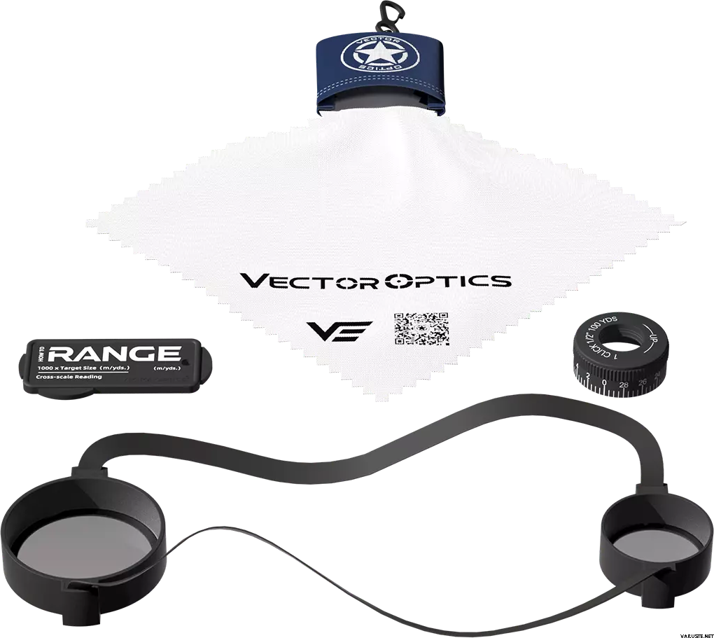 Linssisuojat, käyttöohje, varakorkeustorni, muoviavain, puhdistusliina, 30 mm Picatinny-renkaat
