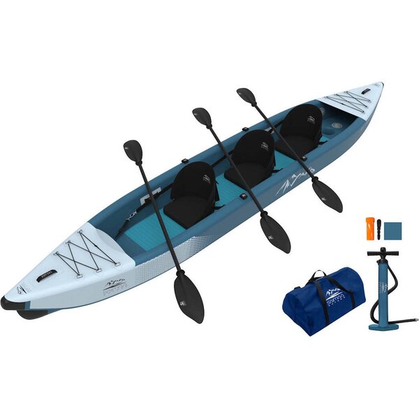 Pakettiin kuuluu kolme melaa, penkkiä ja jalkatukea, nopea kaksitoiminen pumppu (pumppaa vetäessä ja työntäessä), kantokassi, kaksi evää, kansikuminauhat tavaran kuljetukseen sekä korjaussarja. Kanootti on nopea täyttää melontakuntoon noin 15 minuutissa ja helppo pakata takaisin kantokassiin muutamassa minuutissa. Laadukkaassa kajakissa takuu kolme vuotta.