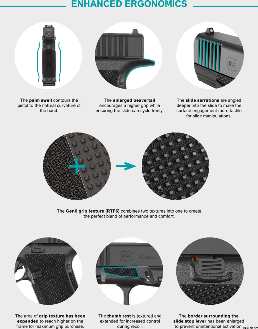 Glock 45 Gen6 on Glockin 6. sukupolven pistooli, joka yhdistää täysikokoisen rungon ja kompaktin luistin. Crossover-malli on suunniteltu erityisesti ergonomiaa ja hallittavuutta silmällä pitäen sopimaan erikokoisiin käsiin ja toimimaan luotettavasti toistuvassa käytössä. Glock 45 Gen6 jatkaa Glockin perinteitä rakenteen ja toimintaperiaatteen kehittämisessä, tarjoten käyttäjälähtöisen muotoilun ja parannetun otteen RTF6-teksturoinnin ansiosta.