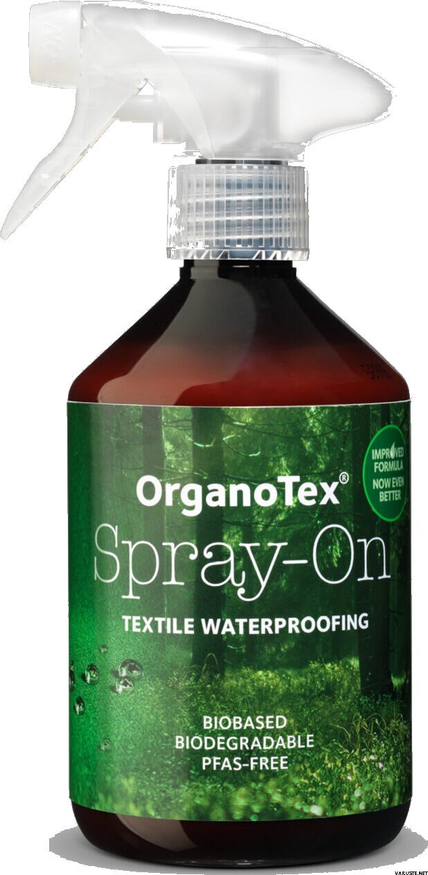 OrganoTex Spray-On Textile Waterproofing 500ml on tehokas ja hellävarainen kyllästesuihke, joka palauttaa tekstiilien vettä ja likaa hylkivät ominaisuudet ilman pintaan muodostuvaa kalvoa. Suihke on tekstiilikylläste ulkoiluvaatteille ja muille tekstiileille, ja se auttaa suojaamaan kuituja sekä pidentämään varusteiden käyttöikää. Käsittely säilyttää materiaalin hengittävyyden, tuntuman ja värin. Sopii myös kalvomateriaaleille.