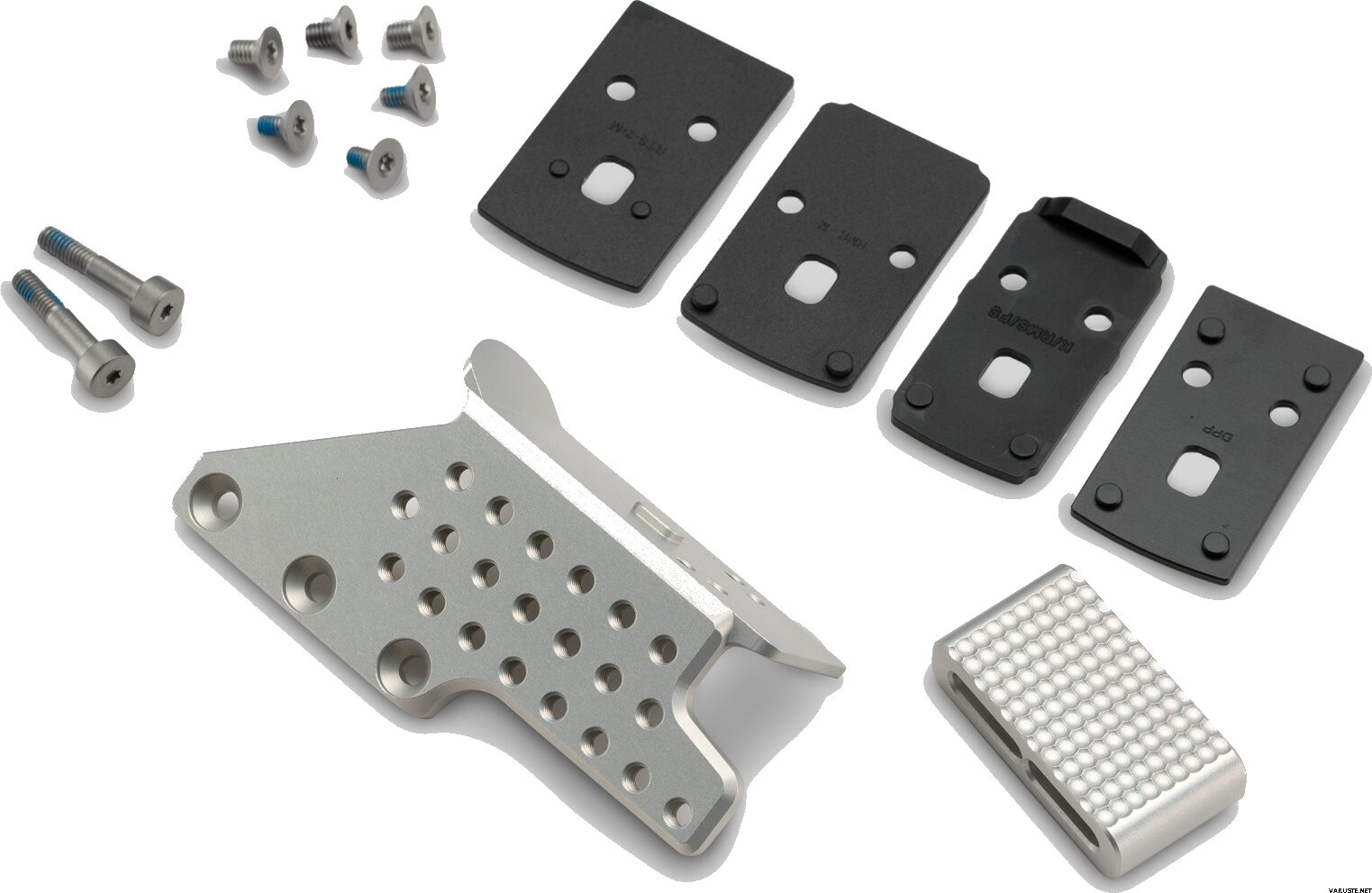 - Paketti sisältää PYRUS Optic Mount -kiinnikkeen, PYRUS käännettävän peukalotukimoduulin, B.A.O optiikkalevyt RMR-, DPP-, RTS2- ja RMSc-jalanjäljille sekä rungon ja peukalotuen kiinnitysruuvit