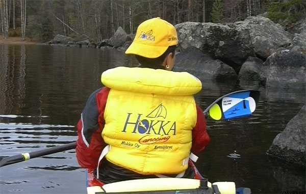 Kauluksellinen melontaliivi, jonka runkona on käytetty lyhytmallista Hokka Fly Fishing -perholiiviä. Kauluksessa heijastin, etupuolella iso tasku sekä hätäpilli. Liivissä lisäksi haarahihna.