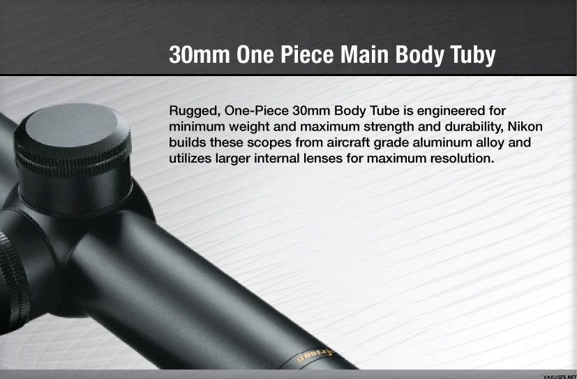 Tehokas kiikaritähtäin yleiskäyttöön. Yksiosaisessa 30 mm:n rungossa on suuri sivu- ja korkeussäätöalue. Suuressa 44 mm:n objektiivilinssissä on Nikonin heijastuksia vähentävä monikerrospinnoite, joten sen valonsiirto-ominaisuudet ja väritasapaino ovat erinomaiset koko 2,5–10-kertaisella suurennusalueella. Säädöt tehdään ¼ kulmaminuutin välein käyttämällä tarkasti kalibroitua, kuuluvan napsahduksen aiheuttavaa säädintä – ja laukaukset osuvat kohteeseen. Tähtäimessä on lisäksi lasiin etsatut ristikot, joiden iskun- ja rekyylinkestävyys on ensiluokkainen. Monarch X -kivääritähtäin sopii erinomaisesti metsästäjille ja ampujille, jotka arvostavat tarkkuutta ja joustavuutta.