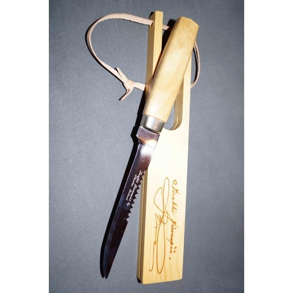Tuotteen kuvausPuutuppinen Kalapuukko. Kuuluisa Puutuppinen Kalapuukko on palannut tuotantoon. Tehtaan entisen toimitusjohtajan ja Iisakki Järvenpään perillisen Mikko Ilmosen suunnittelema kalapuukko palkittiin vuonna 1973 Valtion muotoilupalkinnolla, kunnialla jonka vain suurimmat suomalaiset suunnittelijat ovat osakseen saaneet. Kalapuukon yksinkertainen mutta monikäyttöinen suunnittelu on vertaansa vailla. Puinen tuppi paitsi suojaa puukkoa, toimii myös kalan tainnutuskapulana, sillä voi pitää kalaa pyrstöstä kiinni perattaessa ja se myös puukon kanssa kelluu mikäli sattuisi putoamaan veteen. Nahkainen kantolenkki pitää puukon paikallaan tupessa kuljetuksen aikana. Itse puukko on suunniteltu kalan perkaamiseen, sen terä on valmistettu ruostumattomasta teräksestä ja siinä on hamarapuolella suomustusrauta. Tämä puukko on varma lahja jokaiselle kalastuksesta pitävälle ja sen puinen tuppi mahdollistaa myös näyttävien yritystunnusten painamisen.