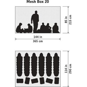 Hyttyshäkki vaeltajille ja retkeilijöille, jotka tykkäävät nukkua taivasalla, mutta ilman hyttysten ininää ja pistelyä. Mesh Box 20 sopii hyvin käytettäväksi Hillebergin Tarp 20:n kanssa. Hyttysboksi 20 majoittaa 4-6 käyttäjää tavaroineen. Lattiaton verkko, jossa verkon alaosat ovat vahvistettu silikonipäällysteellä.