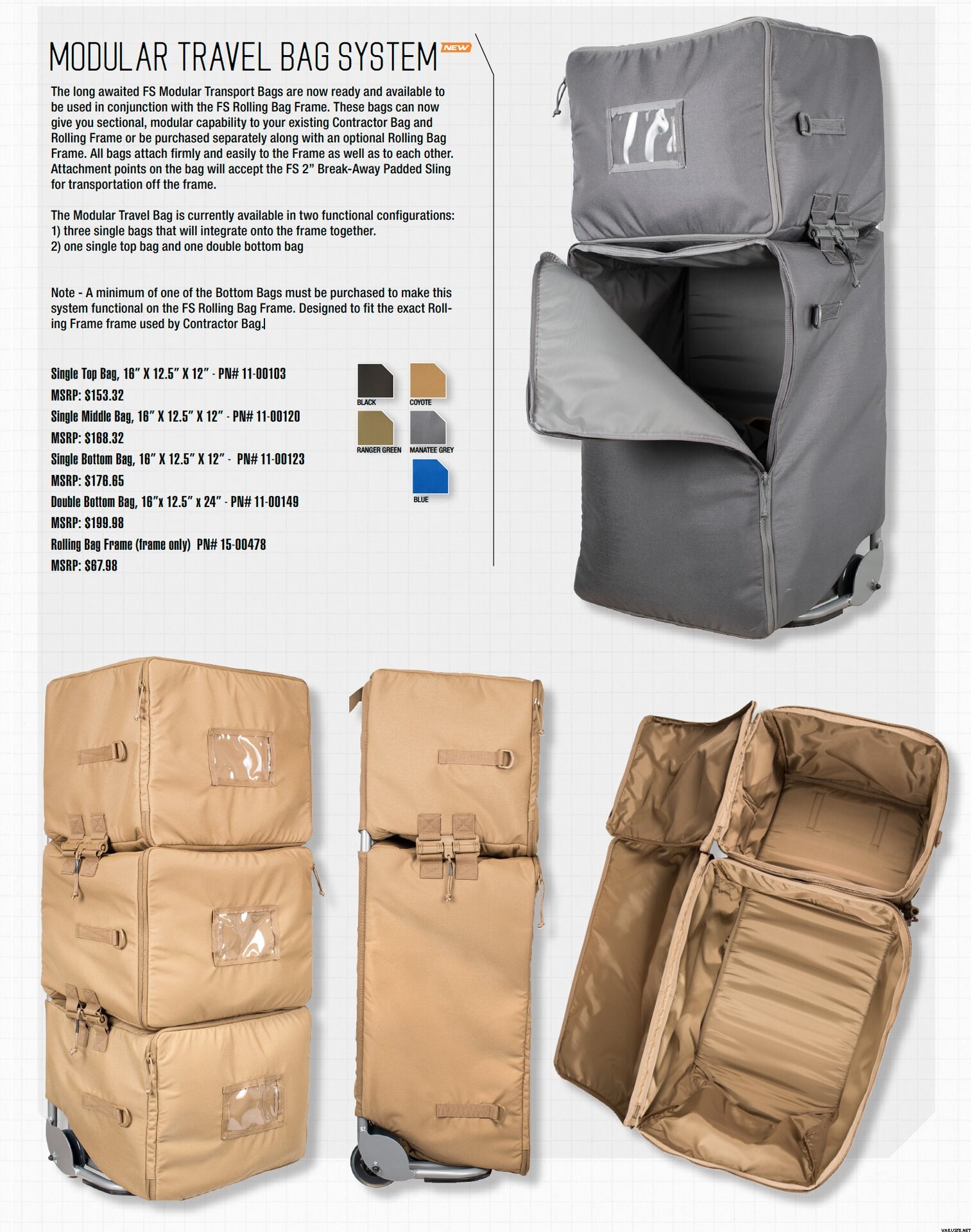 The long awaited FS Modular Transport Bags are now ready and available to be used in conjunction with the FS Rolling Bag Frame. These bags can now give you sectional, modular capability to your existing Contractor Bag and Rolling Frame or be purchased separately along with an optional Rolling Bag Frame. All bags attach firmly and easily to the Frame as well as to each other. Attachment points on the bag will accept the FS 2” Break-Away Padded Sling for transportation off the frame. The Modular Travel Bag is currently available in two functional configurations: 1) three single bags that will integrate onto the frame together. 2) one single top bag and one double bottom bag Note - A minimum of one of the Bottom Bags must be purchased to make this system functional on the FS Rolling Bag Frame. Designed to fit the exact Rolling Frame frame used by Contractor Bag.