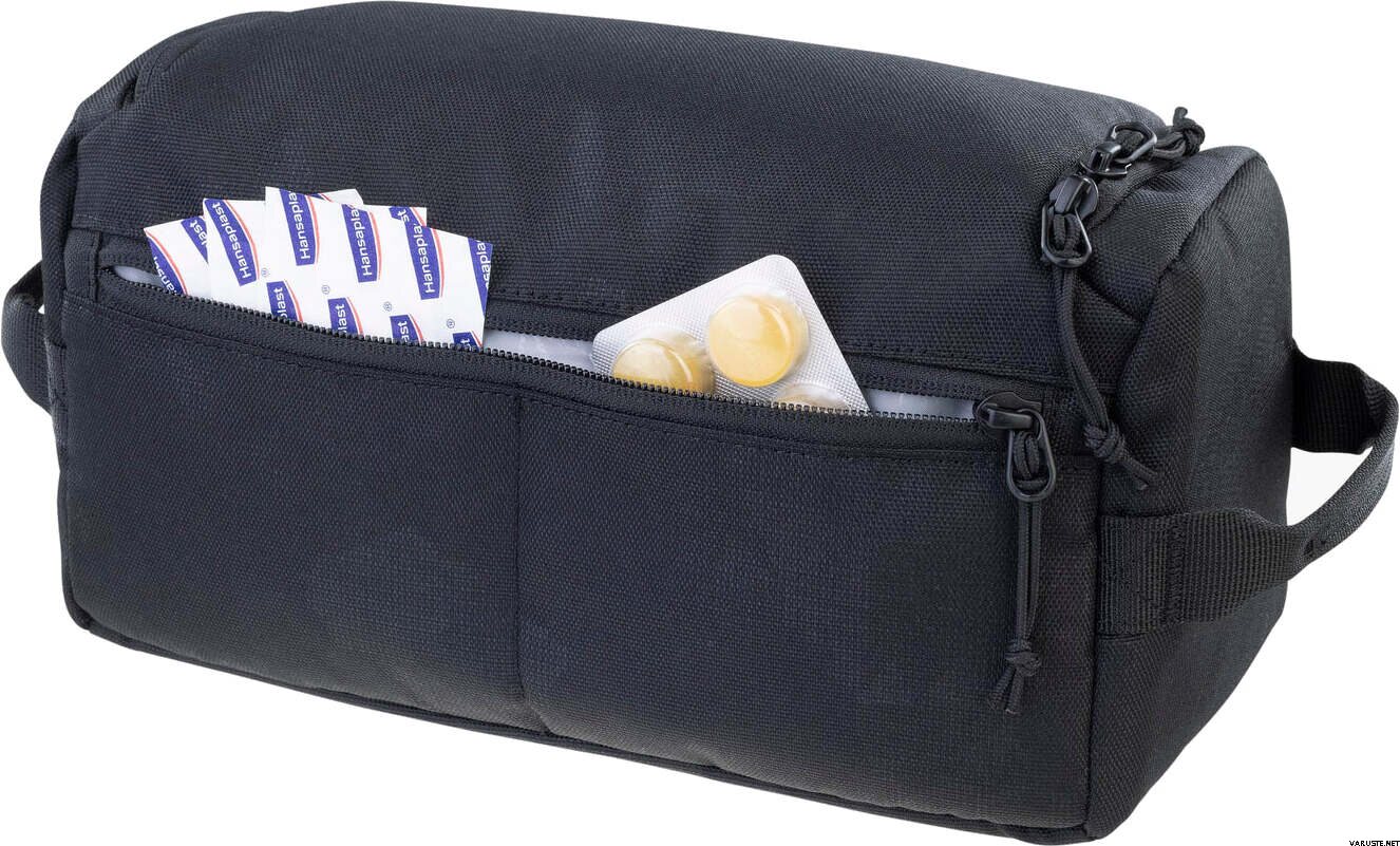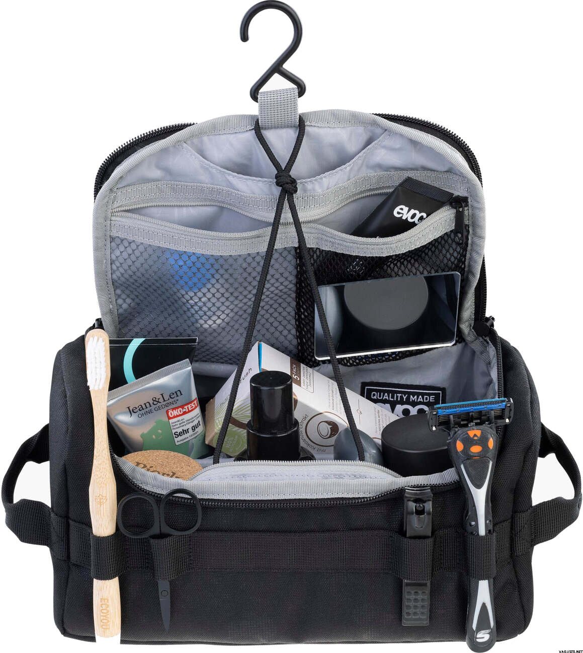 Evocin Wash Bagissa pidät kylppärikamat kätevästi messissä reissussa! Tähän 4-litraiseen boksiin menee just sopivasti varustetta. Siitä löytyy oma vettähylkivä osasto pikkutavaroille, hammasharjapidikkeet 4 harjalle ja mukana on myös irrotettava taskupeili. Toilettilaukun saa myös kätevästi roikkumaan ulkopuolelta löytyvästä ripustuslenkistä.