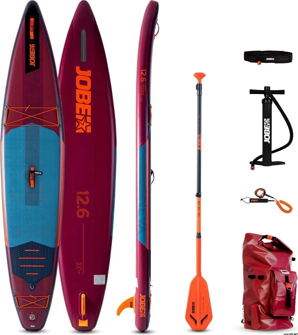 Jobe Neva 12.6 Ilmatäytteinen SUP-lautasetti (381cm x 76cm x 15cm, 320L, 20PSI / 12'6" x 30" x 6"). Täydellinen SUP-lauta retkeilyyn, Neva sisältää uuden "EZ Lock Fin" -evän ja kevyen X-Stitching-rakenteen, joka tarjoaa nopean ja vakaan ajon vedessä. Aero Neva on täynnä hienoja ominaisuuksia, kuten Heat Bonded -teknologia, joka parantaa laatua, sekä ylä- ja alapuolelle rakennettu stringeri, joka lisää jäykkyyttä. Paketti sisältää kaiken tarvittavan vesille lähtöön, ja laudan kokonaispaino on vain 10,2 kg (setin paino 14,6kg).