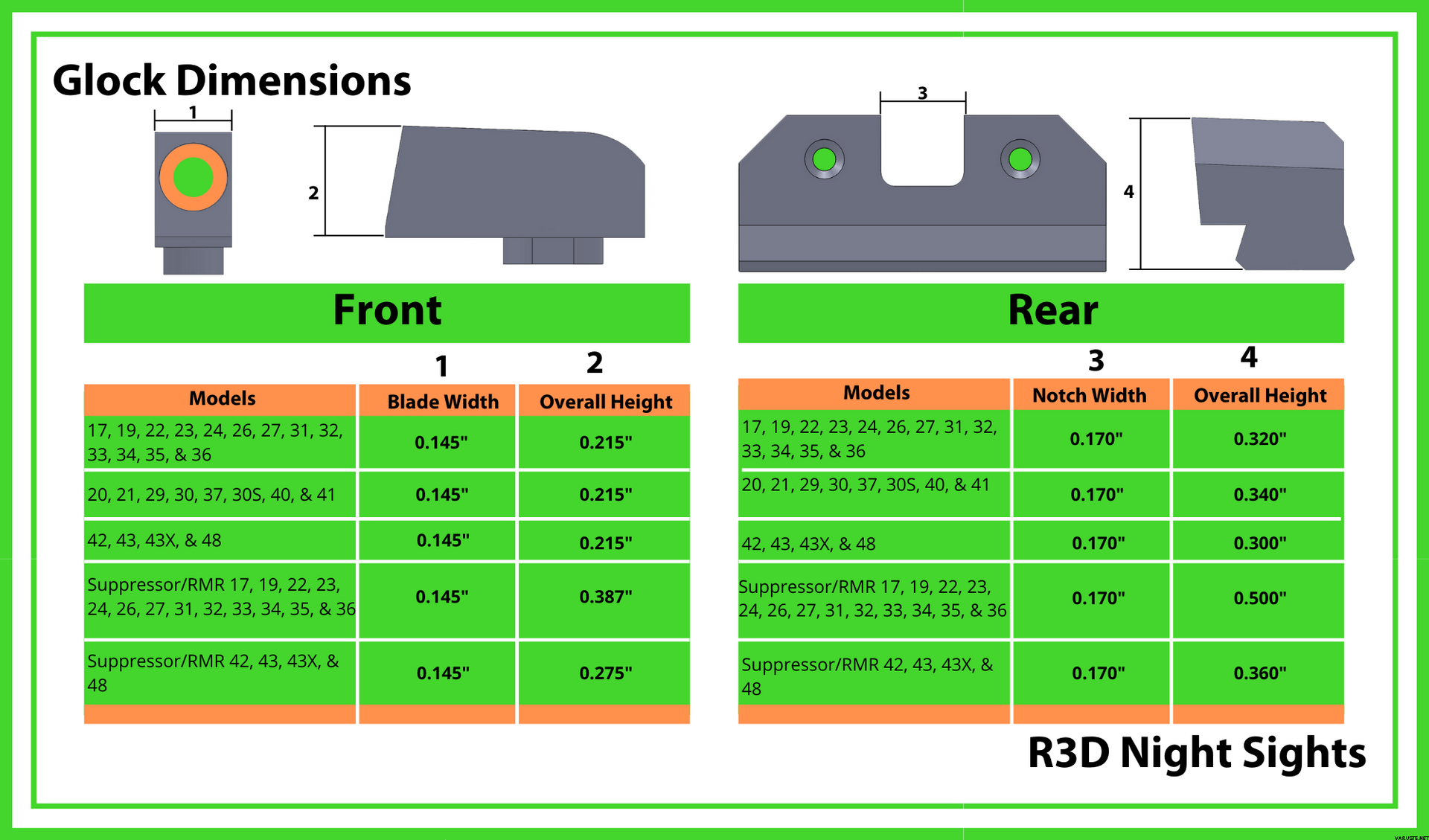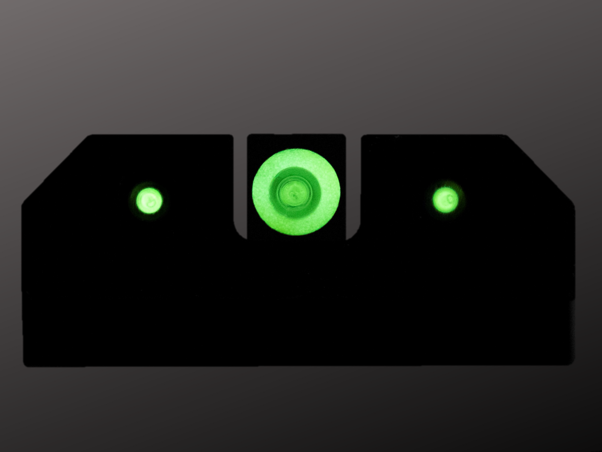 R3D Night Sights feature traditional 3-dot tritium, notch and post, sight picture. The tritium front sight comes equipped with our proprietary photoluminescent orange or green Glow Dot, which absorbs ambient light and glows in low light. The 2-dot tritium blacked-out rear illuminates, giving proper sight alignment while not outshining the front sight for accurate indexing. Our design increases focus on the front sight by using a brighter tritium vial in the front and using the tritium's light to charge the Glow Dot slightly. This slight difference makes the front sight glow more brightly than the two tritium vials in the rear, keeping your focus downrange.