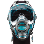 The Neptune Space G.divers mask is available in 2 sizes and 4 color options (emerald, blue, white and pink) and includes an integrated balanced 2nd stage regulator and low pressure hose. The patented bellows style face skirt, molded from premium grade silicon rubber, uses a “spring profile” and large sealing surface, double size of conventional masks (30-45mm), to achieve a very comfortable fit and ample support. This “spring” effect is a combination of the double “S” section and the inner support ribs which allows the G.divers FFM to “float” comfortably on the face. The head strap is directly attached to the face shield, allowing pressure to be distributed equally along the mask skirt. The six straps of the head harness hold the mask in a firm position due to their low elasticity. The tip of each strap (rubber) is wider, making them easier to grasp while wearing neoprene gloves. The FRB II (fast rotating buckle) allows the mask to be donned and doffed quickly. These unique face seal and strap concepts are OCEAN REEF patents.