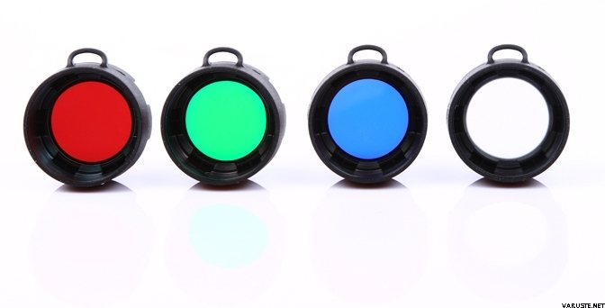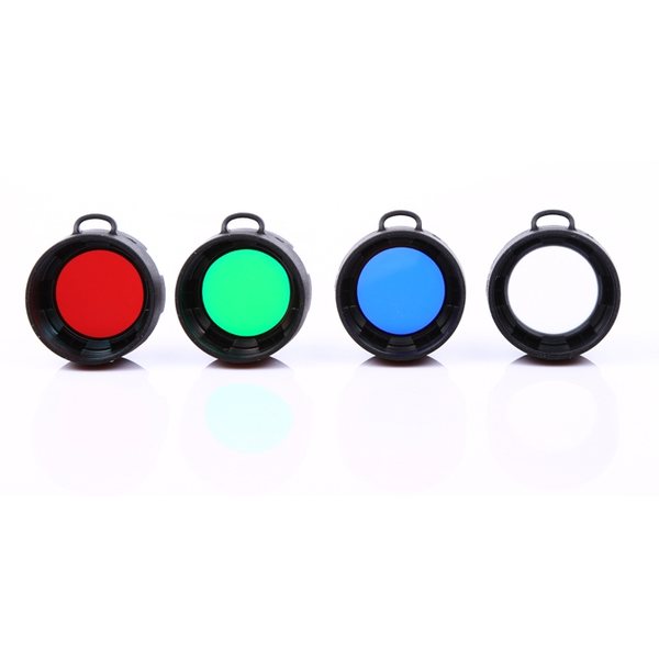 Made of rugged TPU, these filters slip over the head of the flashlight and are available in red, green and blue colors as well as a white diffuser.  They are useful for navigating at night, hunting, law enforcement, and military applications, among others.  Red light is commonly used to help to preserve night vision and also reduces the probability of alerting game animals, which generally do not pick up red light as well.  While also difficult for animals to see, green light additionally helps people with enhanced visual acuity as our eyes are more receptive to green light.  Blue is often used by law enforcement to increase the visibility of sweat and blood, which also helps hunters with tracking animals.  The white diffuser provides softer area light.  Filters are available in different sizes to fit multiple Olight flashlights.
