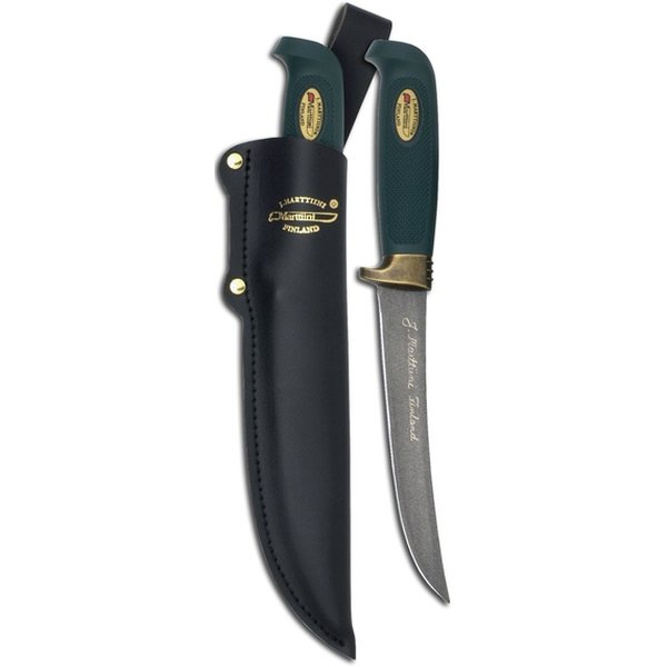 The blades are made from a special stainless chrome steel. Many tests and developing work have been done until the right combination of chrome and the other materials have been founded. The tempering at just the right temperature - determined from Janne Marttiini’s developing work - ensures the durable and strong blade. The composition of the materials (containing 13% of chrome) tempered to 54-56 on the Rockwell hardness scale (HRC) is the best combination for knife blade. The 13% of chrome assures the steel to be durable, absolutely stainless and saltwater resistance (even acid resistance). The hardness under 54 HRC is too low for knife blade, a softer blade is definitely easier to sharpen, but the sharpness will be not a long-lasting and the edge of the blade is too flexible for harder use. If the hardness is over 56 HRC, the blade is certainly hard and retain an edge, but will break more easily. The sharpening is then even impossible without the sharpening wheel.