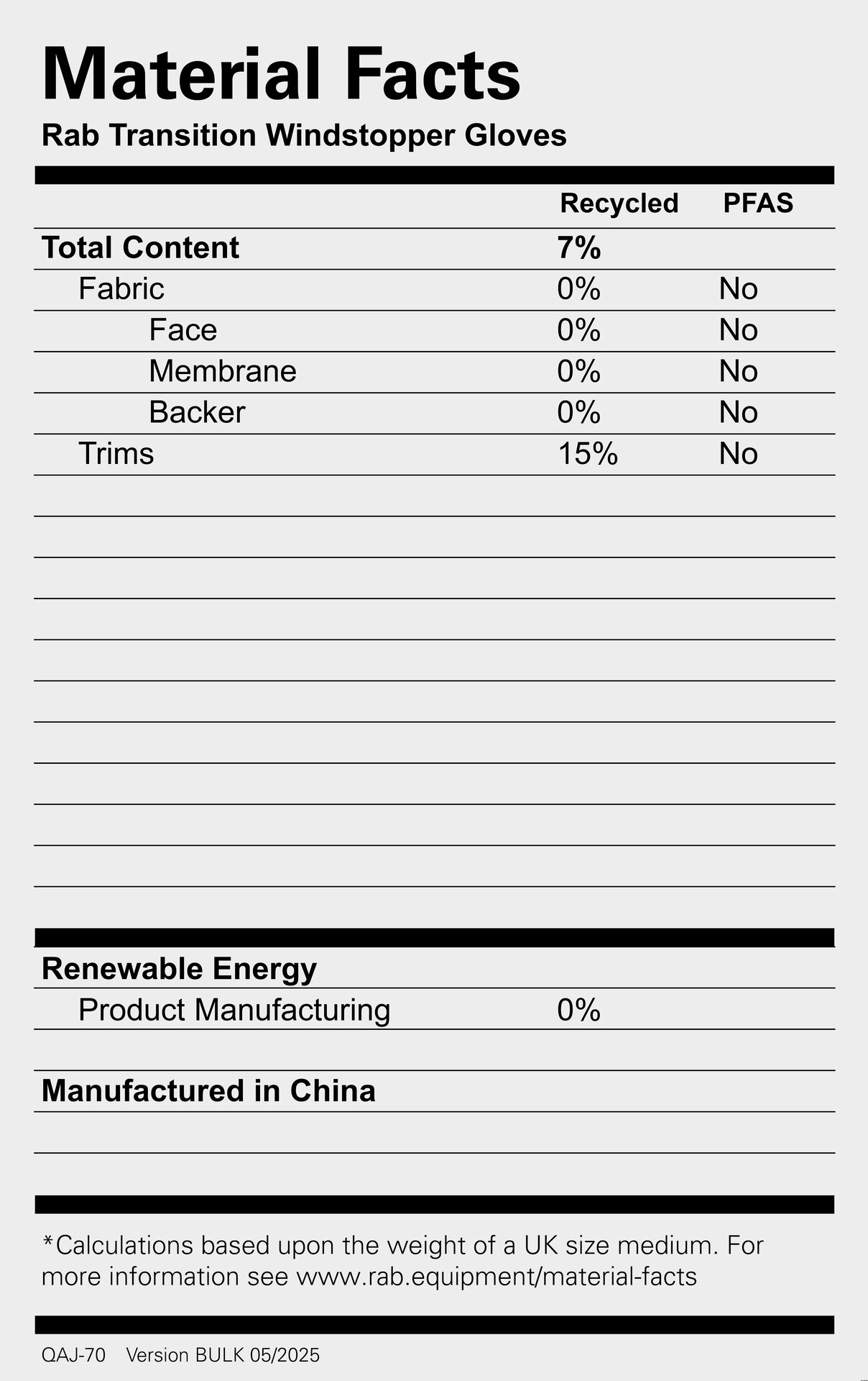 Mănușile Rab Transition Windstopper oferă o protecție excepțională împotriva frigului și a vântului, fiind perfecte pentru plimbările de iarnă și alergările montane. Aceste mănuși ușoare sunt concepute pentru a oferi căldură fără a adăuga volum, asigurând confort și dexteritate. Ideale pentru activități precum drumețiile pe deal, alergarea și drumețiile montane, acestea prezintă un design respirabil care permite evacuării umezelii, ținând în același timp vântul la distanță. Fabricate cu produse Windstopper de la Gore-Tex Labs, acestea sunt perfecte pentru aventuri rapide în condiții dificile.