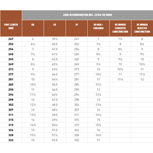 Рекомендуя размеры обуви, LOWA рассчитывает дополнительную длину 15 мм (12 мм для детей). Это уже было рассмотрено в следующей информации. Индивидуальные формы стопы и личные предпочтения могут отличаться от этих рекомендаций.