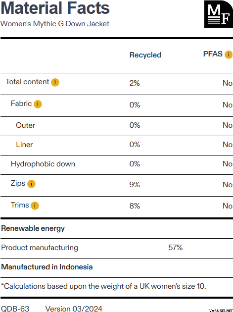 Mythic G s povrchovou úpravou DWR bez fluórovaných uhľovodíkov a dodávaný s ľahkým vreckom na veci sa bez námahy stlačí vo vašom batohu a je pripravený na nasadenie, keď klesne ortuť.