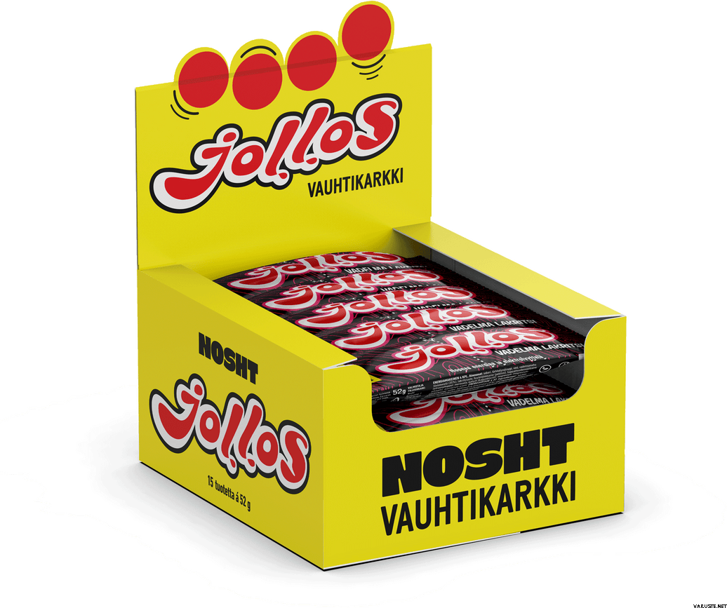 Obľúbené energetické žuvačky Nosht boli práve vylepšené! Energetické žuvačky Jollos sú v podstate rovnaké lahodne mäkké žuvačky, ktoré sa rozplývajú v ústach, ako žuvačky „Vauhtikarkki“. Zmenil sa len tvar a balenie. Navyše Nosht pridal do zmesi trochu viac vyrovnávacích elektrolytov.