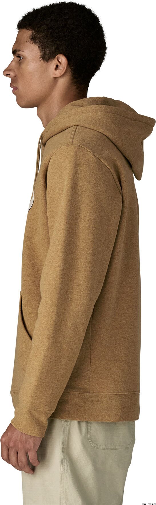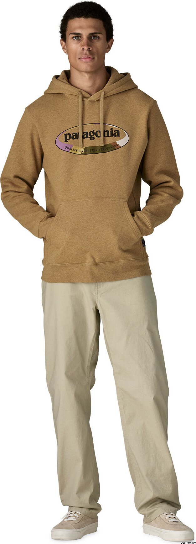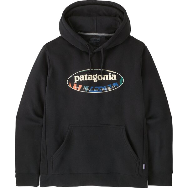 Patagonia '95 Oval Logo Uprisal Hoody Mens kombinerar en klassisk oval logotyp-look med en slitstark känsla och är tillverkad helt av återvunnet tyg. Denna hoodie är tillverkad för vardagsbruk, med en mjuk borstad insida för komfort och naturlig stretch för enkel rörelse. Ribbstickade sidopaneler, manschetter och fåll hjälper den att röra sig med kroppen samtidigt som den bibehåller en snygg passform. Den främre fickan och den justerbara dragskohuvan ger praktisk värme, och hoodien är tillverkad i en Fair Trade-certifierad fabrik.