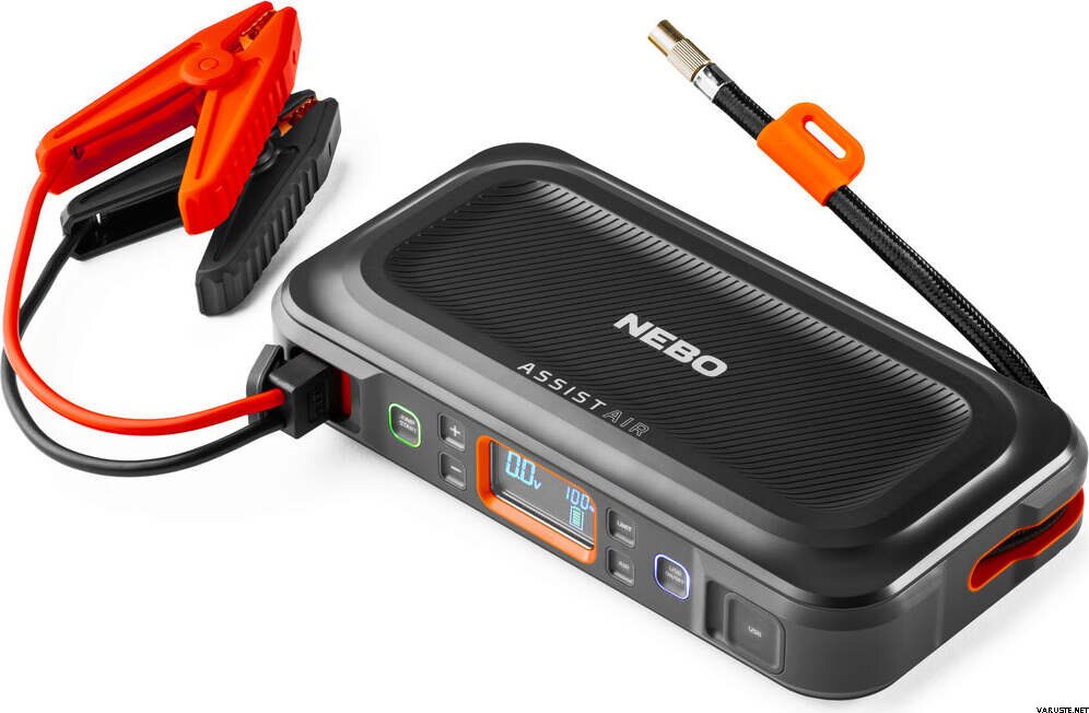 Nebo Assist Air Jump Starter är en kraftfull powerbank utformad för att erbjuda heltäckande lösningar för förare. Den här enheten kombinerar fyra viktiga funktioner: starthjälp, uppblåsning, laddning och belysning, vilket gör den till en utmärkt följeslagare på vägen. Den låter dig starta ett 12-volts fordonsbatteri, pumpa däck och ladda USB-enheter som smartphones och surfplattor. Den integrerade lampan ökar säkerheten i nödsituationer.
