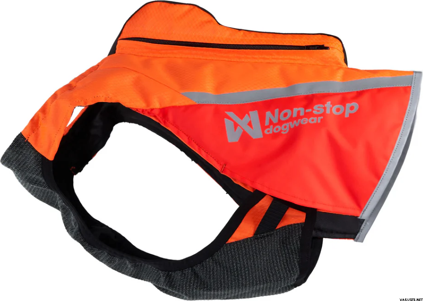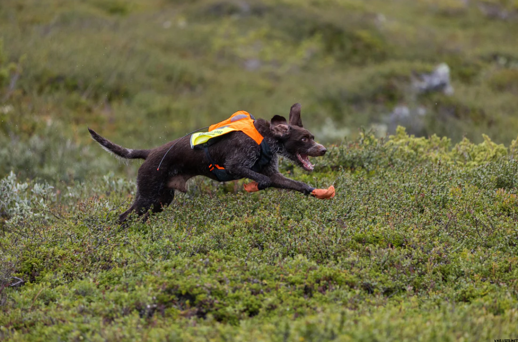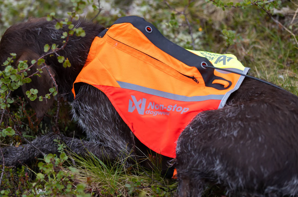 En GPS-ficka med dragkedja högst upp på västen håller spårningsenheten på plats och skyddar den från att fastna i grenar. Den ljusorange färgen och de reflekterande 3M-detaljerna säkerställer synlighet i dimma, svagt ljus och varierande väderförhållanden. Röda och gula sidopaneler indikerar vilken riktning din hund är vänd, en värdefull funktion för spårning och jakt.