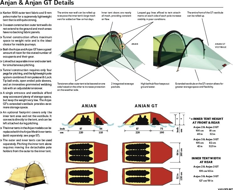 ANJAN och Anjan GT-modellerna med förlängd absid är superlätta tält avsedda att användas i varmare klimat, under barmarkssäsongen och i mer skyddad terräng. Trots den låga vikten är de robusta. Under utvecklingsfasen satte vi upp Anjan i vår vindmaskin (en ombyggd snökanon) och lät tältet stå där under 6­ till 8 timmar i mycket hårt vind. Anjan klarade det utan problem.