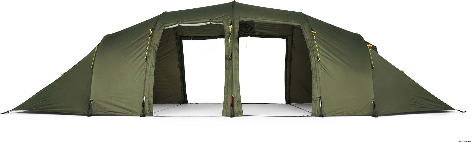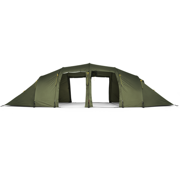 Vallhall är idealisk för stora familjer eller som basecamptält för större grupper. Tältet har en invändig höjd på 180 cm, vilket gör det till ett mycket bekvämt tält att vara i. Det har sex ingångar och två av dem har myggnät, som tillsammans med justerbara ventiler säkerställer ett bra inomhusklimat. Det är också möjligt att göra alla dörrar till en baldakinlösning med 170 cm stolpar. Den är kompatibel med vår Helsport Lavvu spis, eller till och med en liten lägereld, eftersom tyget har en brandhämmande behandling.