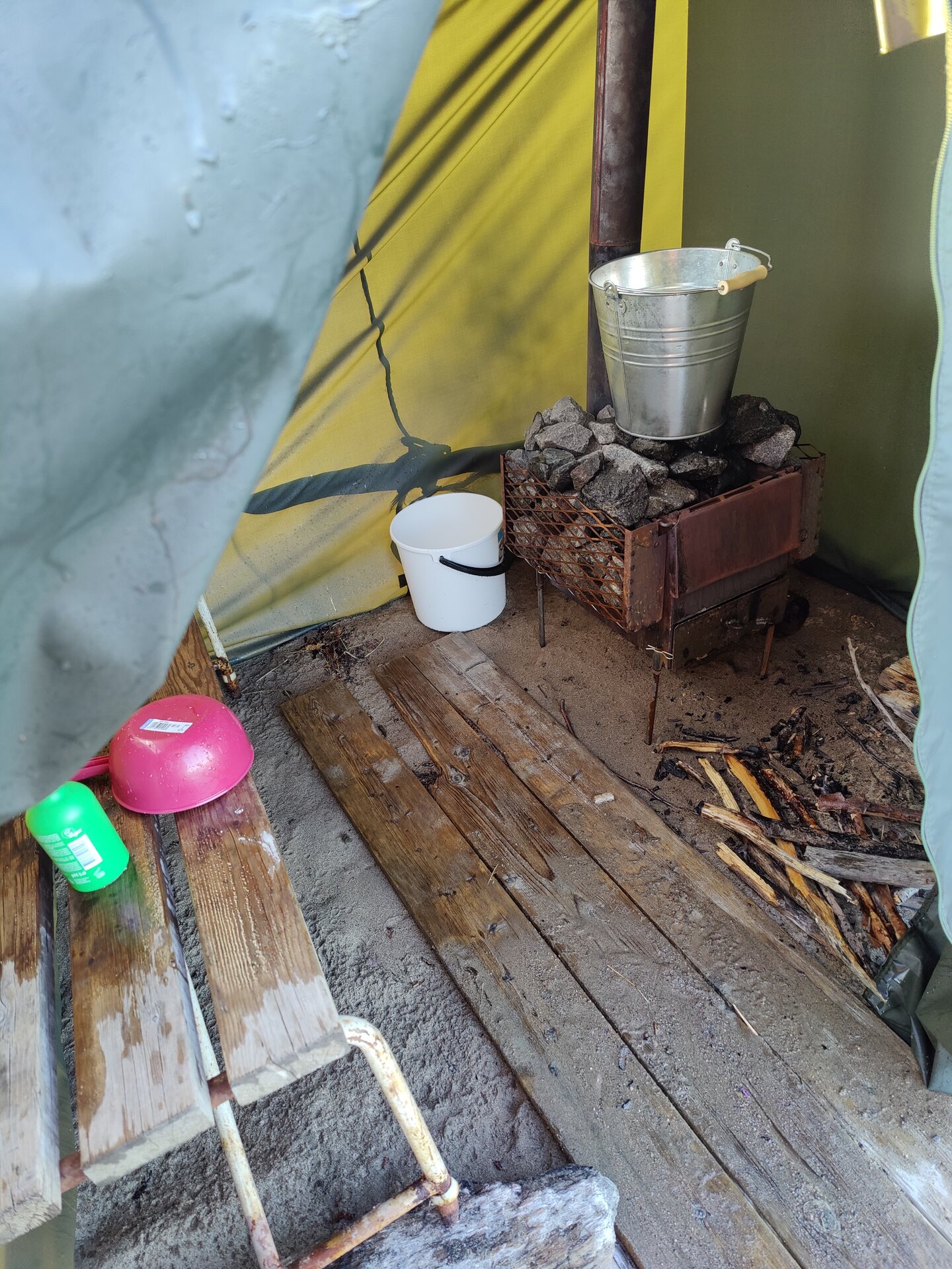 Interiören är tillräckligt stor för att rymma en bänk för två personer, två personer och kaminen. Kaminen är placerad längst till höger, sett från ingången. Bänken är placerad på vänster vägg, under fönstret. Fönstret längs bänkväggens övre kant ger lite ljus och en möjlighet att kika ut. Ingången är en enkel springa med dragkedja. En bit snöre är fäst vid takskarven på bakväggen. Detta är en fästpunkt för en bastutermometer som hjälper dig att hålla koll på temperaturen och inte överhetta tältet.
