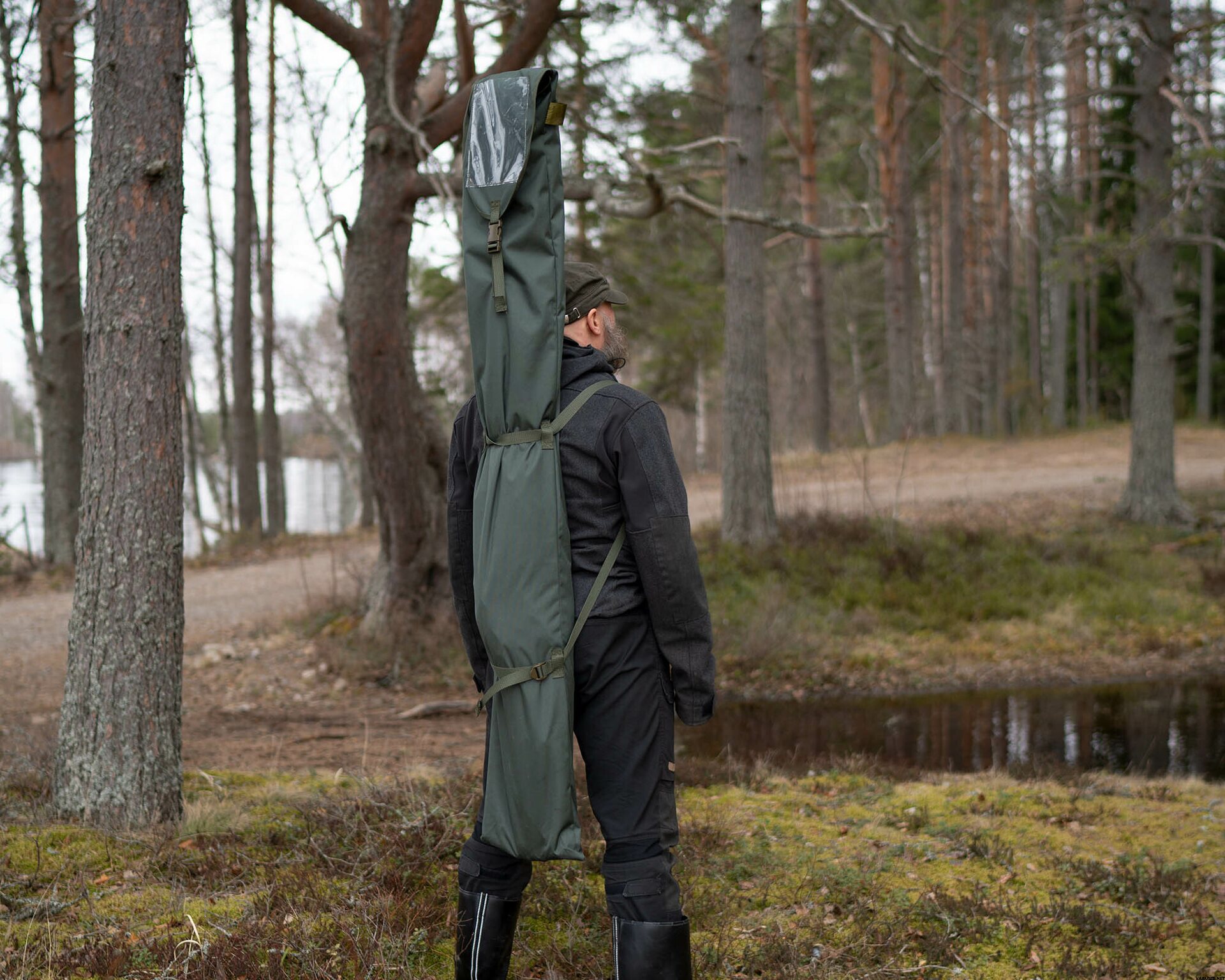 Tältet, stängerna och pålarna packas smidigt i en bärväska för transport. Axelremmarna gör att du kan bära det som en ryggsäck, vilket frigör händerna för kök eller andra tillbehör.