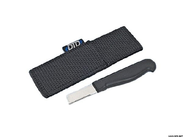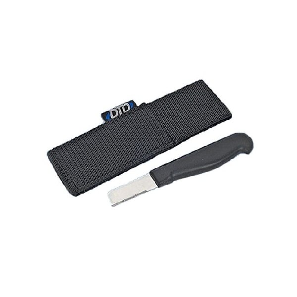 Small knife made of stainless-steel with jagged blade. Comes with a pocket for the knife.